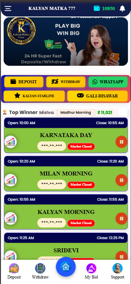 Really impressed with this app. Fast withdrawal hai aur system fully automatic hai. All market hai is app me including Gali Disawar. Best satta matka app so far.